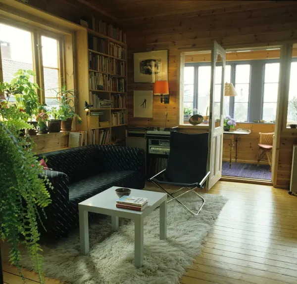 Stue med bokhyller, stol, sofa, bord, stereoanlegg i enebolig, Nordstrand, Oslo. Illustrasjonsbilde fra Bonytt 1983.