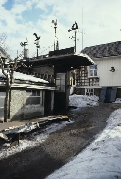 Værhaner på taket til smed Ragnar Evensen, Vålerenggata 38, Vålerenga, Oslo. Illustrasjonsbilde fra Bonytt 1983.