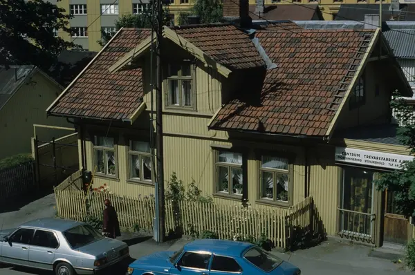 Gammelt trehus med Centrum Trevarefabikk AS, Vålerenga, Oslo. Illustrasjonsbilde fra Bonytt 1983.