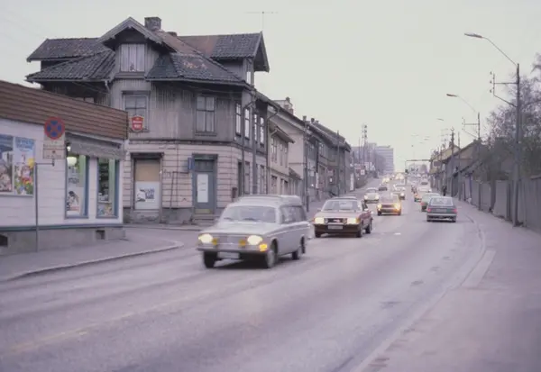 Trehusbebyggelse og biltrafikk i Strømsveien på Vålerenga i Oslo. Totengata inn til venstre. Illustrasjonsbilde fra Bonytt 1983.
