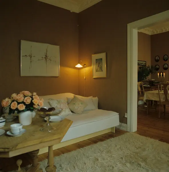 Sovesofa i kroken inn mot spisestuen i gammel leilighet på Frogner i Oslo. Dører er fjernet for å gi større romfølelse. Illustrasjonsbilde for Bonytt 1983.