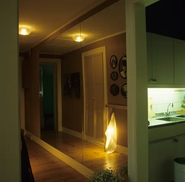 Speil fra gulv til tak gir bedre romfølelse i lang, smal gang i gammel leilighet på Frogner i Oslo. Illustrasjonsbilde for Bonytt 1983.