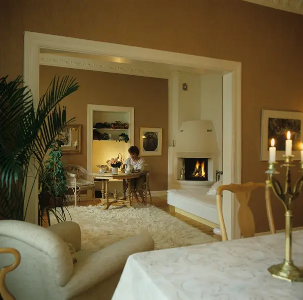 Stue i gammel leilighet på Frogner i Oslo. Dører er fjernet for å gi større romfølelse. Illustrasjonsbilde for Bonytt 1983.