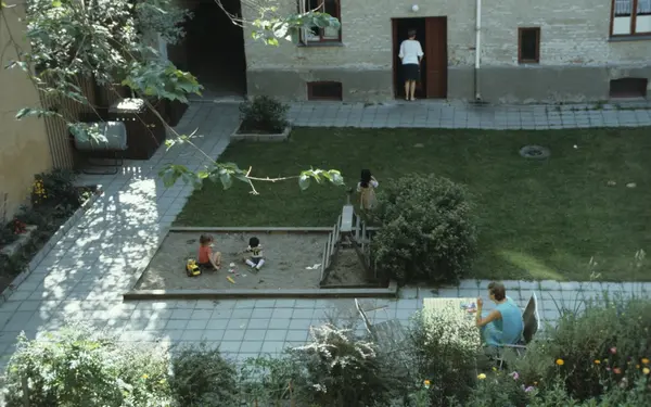 Opparbeidet hage med sandkasse i bakgård, Sofienberg i Oslo. Illustrasjonsbilde for Bonytt 1983.