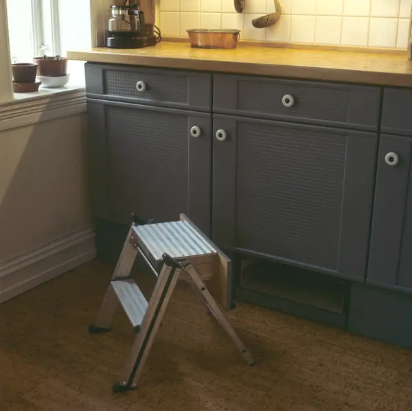 Detalj på kjøkken i leilighet på Frogner i Oslo. Sokkel med plass til liten sammenleggbar gardintrapp. Illustrasjonsbilde for Bonytt 1983.