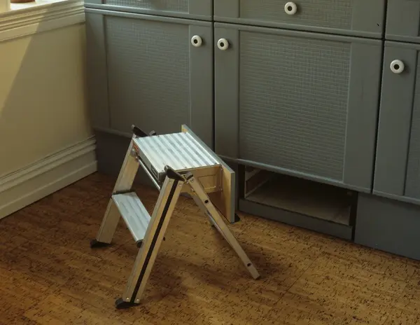 Detalj på kjøkken i leilighet på Frogner i Oslo. Sokkel med plass til liten sammenleggbar gardintrapp. Fotografert for Bonytt 1983.