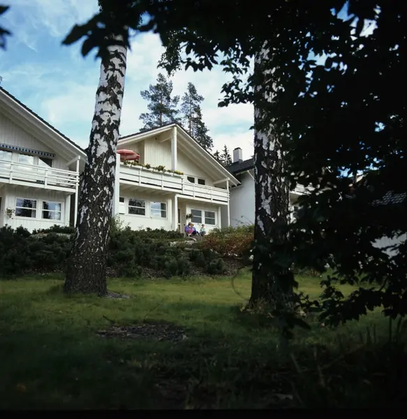 Kjedet hus bygget i 1982 på Slemdal i Oslo. Arkitekt Christian Malon. Illustrasjonsbilde fra Bonytt 1986.