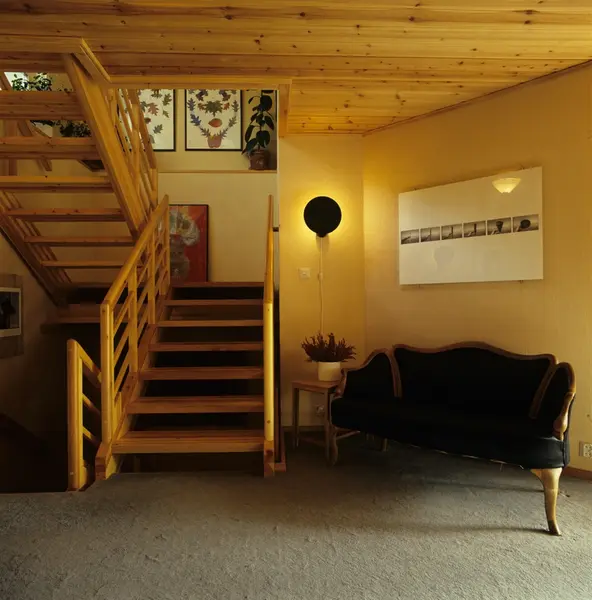 Trappegang i kjedet hus bygget i 1982 på Slemdal i Oslo. Arkitekt Christian Malon. Illustrasjonsbilde fra Bonytt 1986.