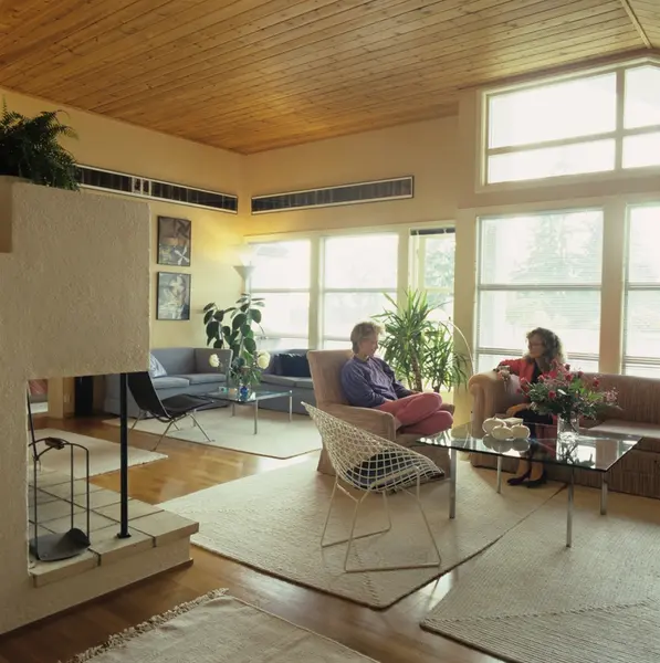 Stue med to sofagrupper, i kjedet hus bygget i 1982 på Slemdal i Oslo. Arkitekt Christian Malon. Illustrasjonsbilde fra Bonytt 1986.