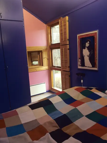 Fargerikt soverom med speilkledd titteluke til arbeidsrommet i Vestbyveien 17, Oslo, et prefabrikert "svenskehus" fra 1948, ombygget i 1976. Fotografert for Bonytt 1986.