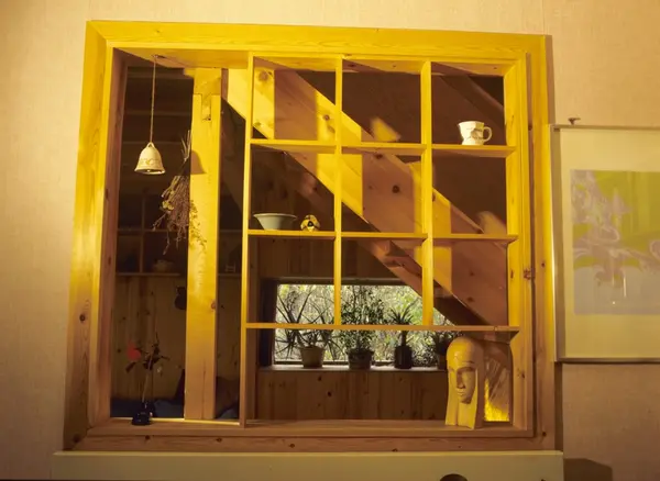 Hyller i gammel vindusåpning mellom gammel og ny del i Vestbyveien 17, Oslo, et prefabrikert "svenskehus" fra 1948, ombygget i 1976. Illustrasjonsbilde fra Bonytt 1986.