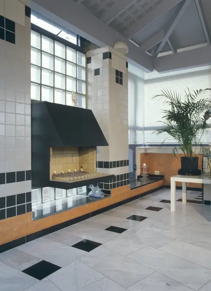 Tårnbygg på Grünerløkka i Oslo, utvidelse av en loftsleilighet, her stuen med peisen og glassbyggesteinen på peisveggen, illustrasjonsbilde fra Nye Bonytt 1988.
