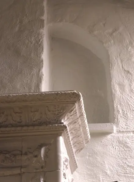 Tårnbygg på Grünerløkka i Oslo, utvidelse av en loftsleilighet, veggen er dekorert med murmotiver, buet nisje, en figur i relieff, illustrasjonsbilde fra Nye Bonytt 1988.