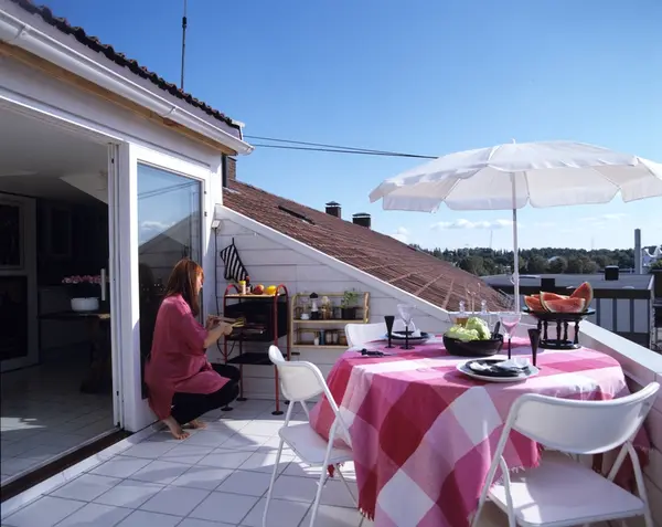 Blokkleilighet etter ombygging, stor terrasse. Illustrasjonsbilde fra Nye Bonytt 1989.