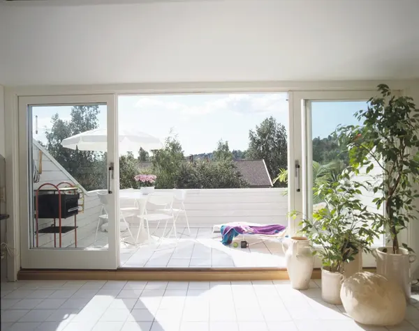 Blokkleilighet etter ombygging, terrassen sett fra stuen. Illustrasjonsbilde fra Nye Bonytt 1989.