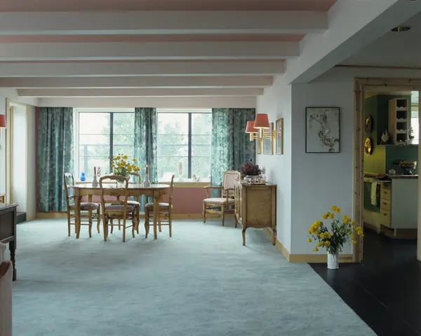 På toppen av bygård i Oslo, spisestuen med åpning mot kjøkkenet. Illustrasjonsbilde fra Nye Bonytt 1989.