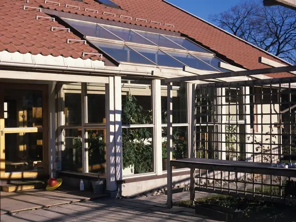 Hagestue med glasstak i husets takflate. Beskytter også mot støy fra sørgående jernbanetrafikk i Oslo-området. Illustrasjonsbilde fra Nye Bonytt 1989.
