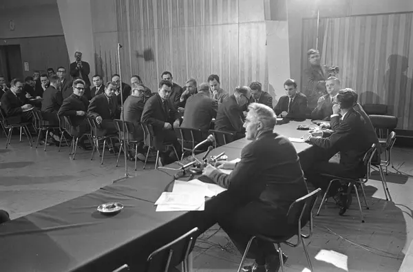 Statsminister Per Borten har pressekonferanse i den store møtesalen i den lave fløyen på vestsiden av Høyblokken i Regjeringskvartalet, oktober 1965. Bortens regjering tiltrådte 12. oktober 1965. Dette er derfor mest sannsynlig den første pressekonferansen etter tiltredelsen, holdt samme dag.