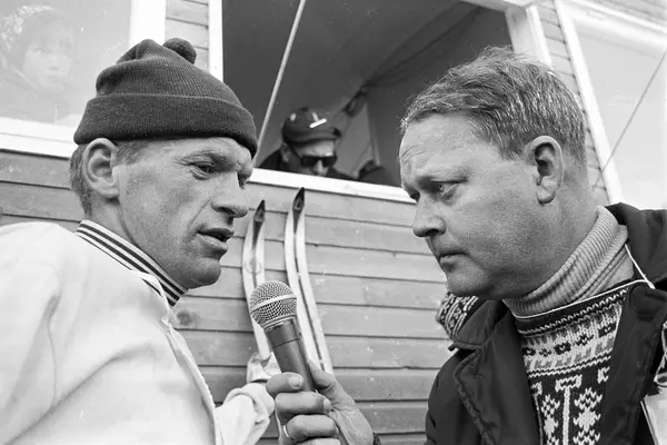 En skiløper blir intervjuet av Bjørge Lillelien, 50 km Holmenkollrennet 1969. Fotografert 15. mars 1969.