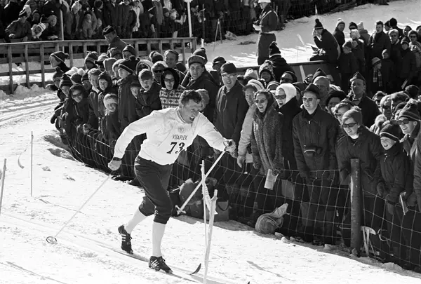 Skiløper Ole Ellefsæter, publikum står langs løypa, 50 km Holmenkollrennet 1969. Fotografert 15. mars 1969.