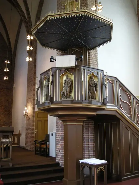 2. påskedag i Vestre Aker kirke, Oslo, 24.03.2008. Prekestol med himling. Hvitt klede.