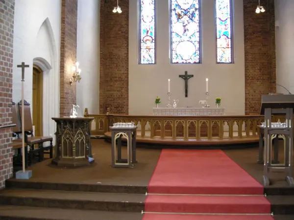 2. påskedag i Vestre Aker kirke, Oslo, 24.03.2008. Fra koret i kirken. Alter med hvitt klede. Døpefont og kanne, lesepult. Glassmalerier.