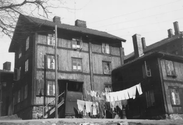 Fra trehusmiljøet på Enerhaugen, Oslo. Klestørk på snorer foran bolighus.