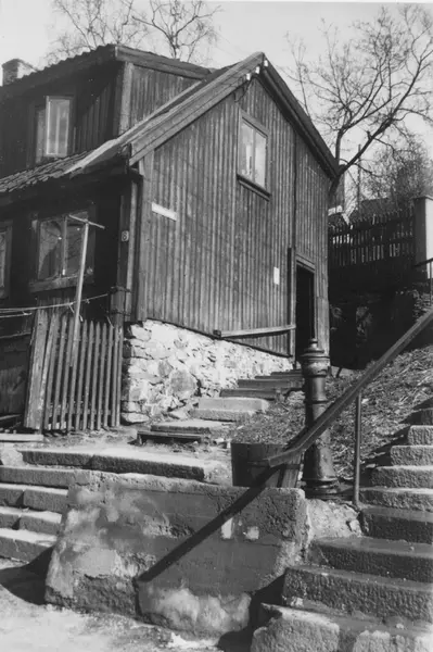 Fra trehusmiljøet på Enerhaugen, Oslo. Bolig ved trappeløp og vannpost.