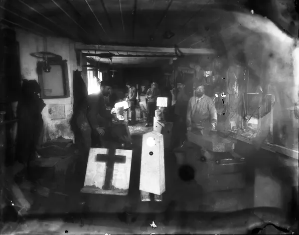Interiør, antatt fra John F. A. Køltzows "Stenhuggeri, Sliberi og Lager af Gravmonumenter", Akersveien 06-10, Hammersborg, Oslo. Arbeidere i arbeidsprosess med gravsteiner.