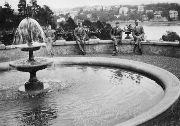 Springvann ved Oscarshall, 1932. Fire menn sittende i bakgrunnen.