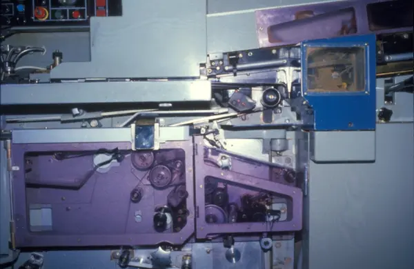 Mollins sigarettmaskin mark 9. Produserte 4000 sigaretter i minuttet. Fabrikklokale. Tiedemanns Tobaksfabriks kursmateriell for maskinførerkurs, røyketobakk, pakkeavdelingen.