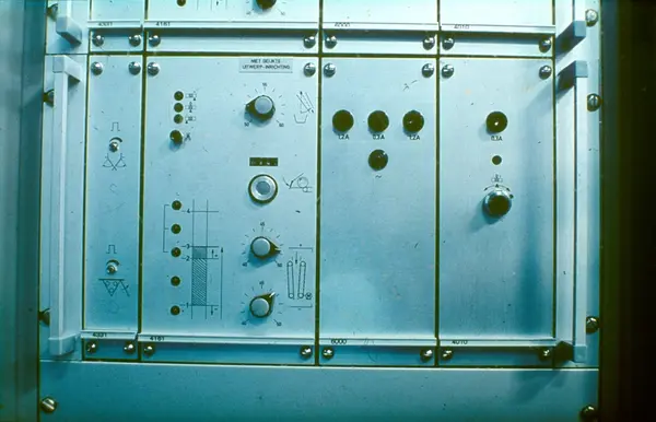 Styreskapet til veiemaskinen, veieelektronikk. Fabrikklokale. Tiedemanns Tobaksfabriks kursmateriell for maskinførerkurs, røyketobakk, pakkeavdelingen.
