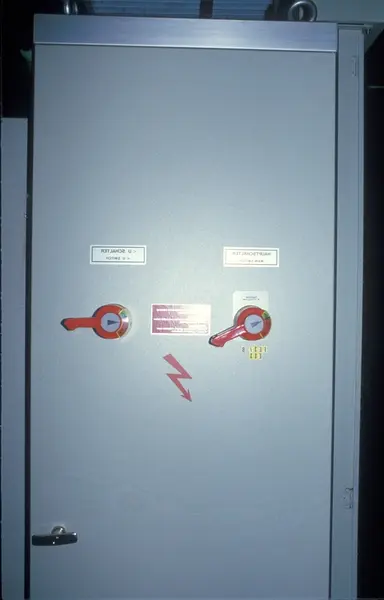 Hovedbryter strøm, veiemaskin. Fabrikklokale. Tiedemanns Tobaksfabriks kursmateriell for maskinførerkurs, røyketobakk, pakkeavdelingen.
