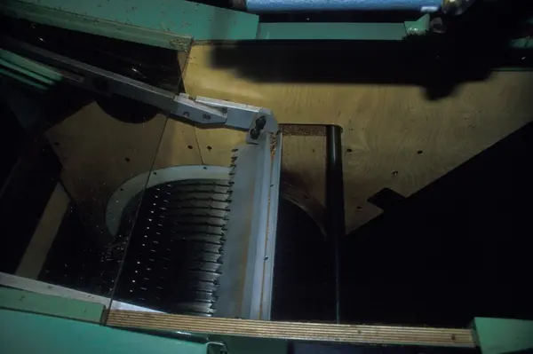 Veiemaskin. Fabrikklokale. Tiedemanns Tobaksfabriks kursmateriell for maskinførerkurs, røyketobakk, pakkeavdelingen.