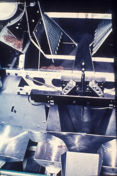 Veiemaskin. Fabrikklokale. Tiedemanns Tobaksfabriks kursmateriell for maskinførerkurs, røyketobakk, pakkeavdelingen.