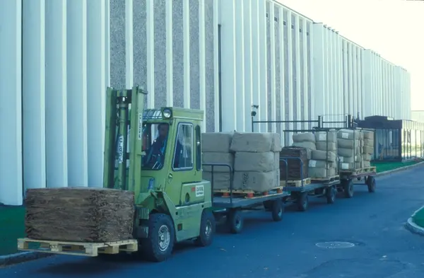 Transport av tobakk fra lager til produksjon ved Tiedemanns Tobaksfabrik.