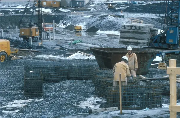 Byggeplass. Konstruksjon av Tiedemanns nye råtobakklager på Hovin i 1978.