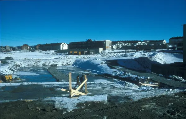 Byggeplass. Konstruksjon av Tiedemanns nye råtobakklager på Hovin i 1978.