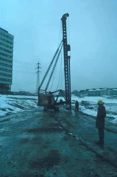 Byggeplass. Konstruksjon av Tiedemanns nye råtobakklager på Hovin i 1978.
