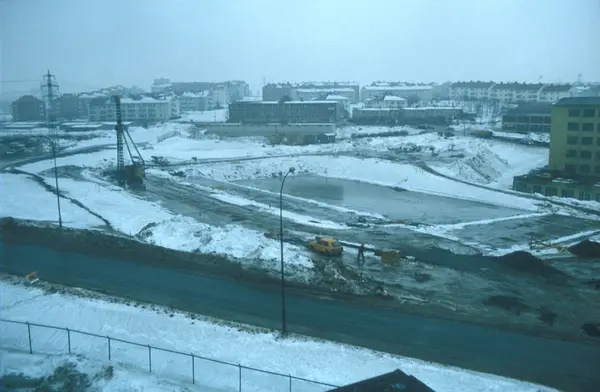 Byggeplass. Konstruksjon av Tiedemanns nye råtobakklager på Hovin i 1978.