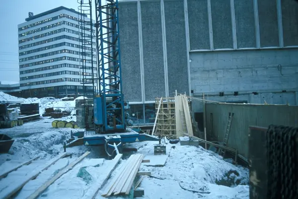 Byggeplass. Konstruksjon av Tiedemanns nye råtobakklager på Hovin i 1978.
