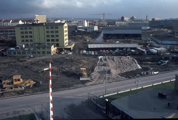 Byggeplass. Konstruksjon av Tiedemanns nye råtobakklager på Hovin i 1978.