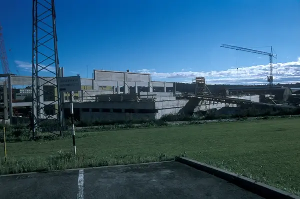 Byggeplass. Konstruksjon av Tiedemanns nye råtobakklager på Hovin i 1978.