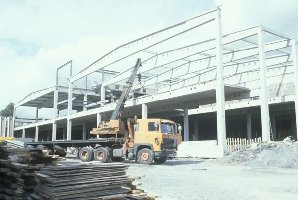 Byggeplass. Utvidelse av Tiedemanns fabrikk på Hovin i 1982-83.