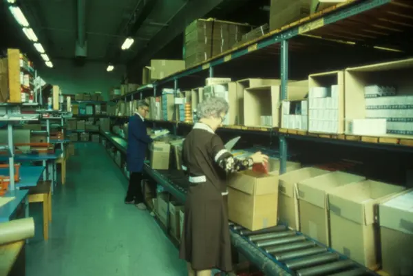 Pakking av tobakk i esker på plukklager. Produksjon på Tiedemanns Tobaksfabrik.