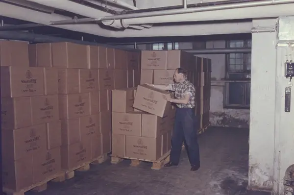 Flytting av esker på ferdigvarelageret hos Tiedemanns Tobaksfabrik.