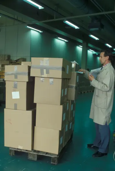 Pall med esker. Lager og transport hos Tiedemanns Tobaksfabrik.