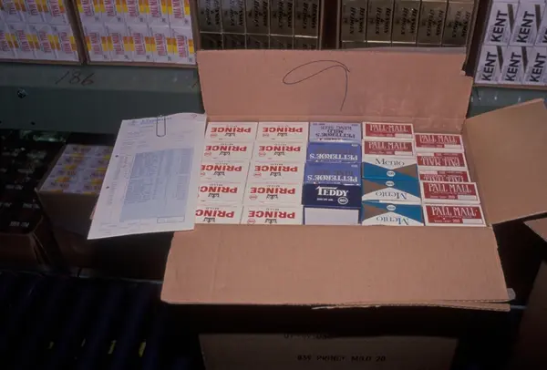 Fabrikkinteriør. Pakkeavdeling. Produksjon av tobakk hos Tiedemanns Tobaksfabrik.