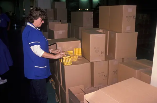 Fabrikkinteriør. Pakkeavdeling. Produksjon av tobakk hos Tiedemanns Tobaksfabrik.