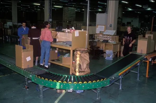 Fabrikkinteriør. Pakkeavdeling. Produksjon av tobakk hos Tiedemanns Tobaksfabrik.